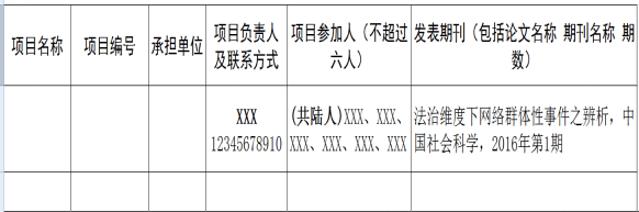 内容:项目名称项目编号承担单位项目主持人项目参加人(包括共几人,人名之间用顿号隔开)发表期刊(包括论文名称期刊名称期数)或应用证明(包括应用名称应用单位日期)。格式如下: