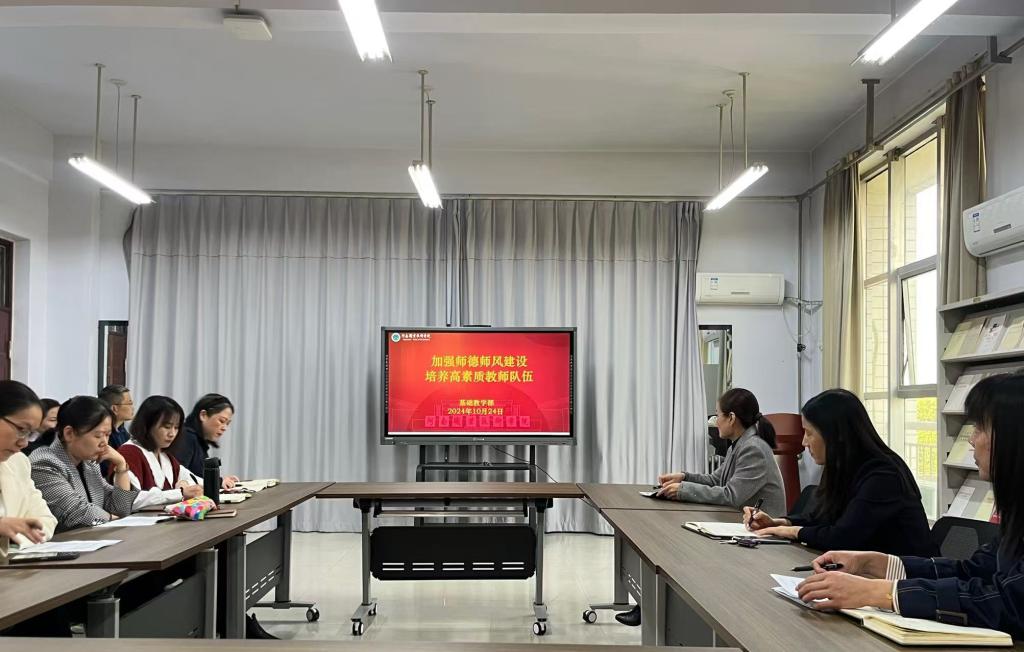 10月24日下午,yl6809永利官网集团在行政楼502召开主题为“加强师德师风建设,培养高素质教师队伍”的师德师风学习会。会议由yl6809永利官网集团主任周翠英主持,52名教职工全部参加了学习。