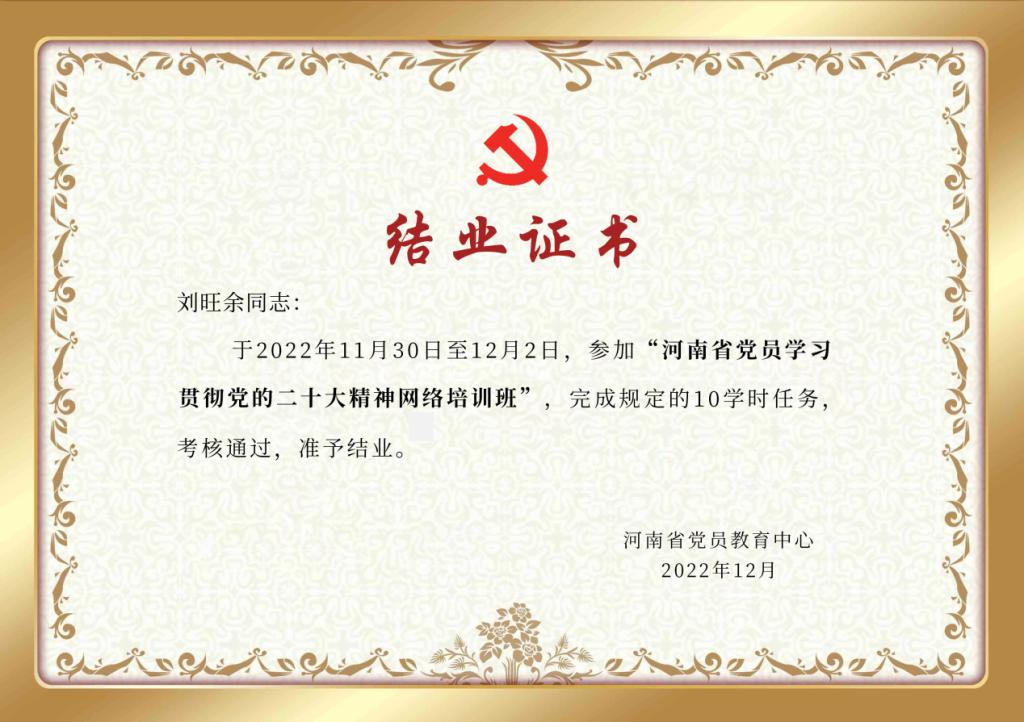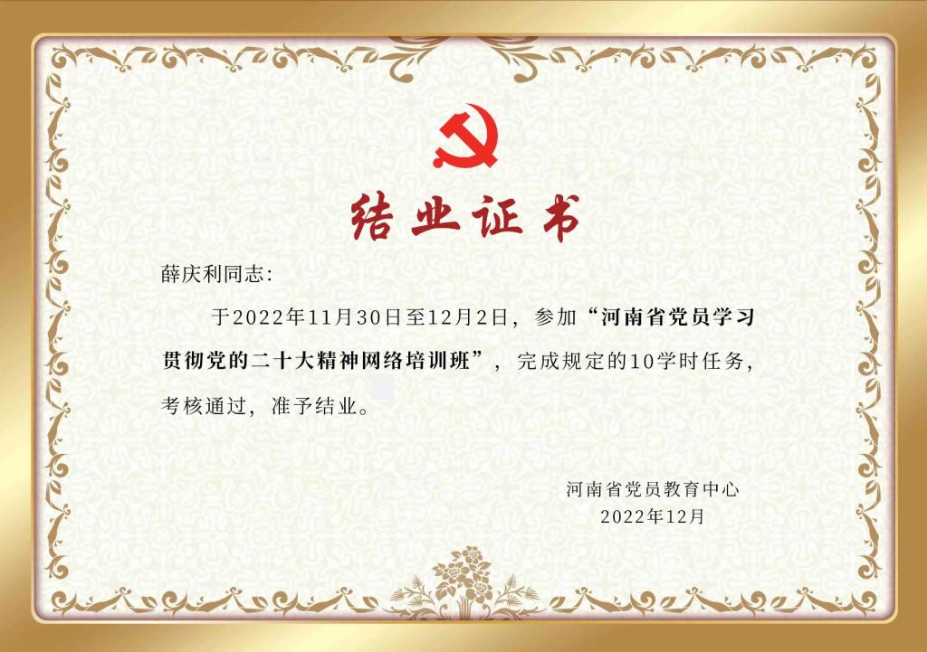 根据省委组织部党员教育处下发的《关于举办河南省党员教育“云课堂”(学习贯彻党的二十大精神网络培训班)的通知》精神,按照院组织部的部署安排,yl6809永利官网集团党支部严格按照《通知》要求认真组织实施,督促我部全体参训党员认真开展学习活动,确保在规定时间圆满完成各项学习任务。