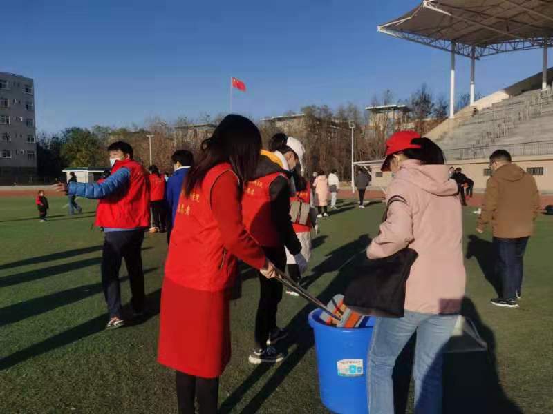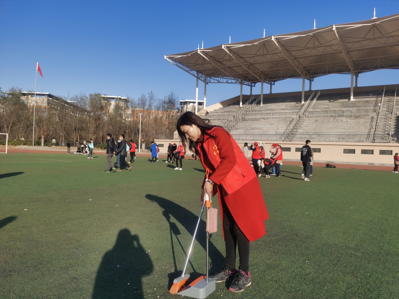 为进一步动员广大师生共同营造文明健康的校园环境,将绿色作为我们生活的主旋律,用行动肩负起绿色环保的重任,营造一个更加优美的校园环境,9日下午15时,老师们相继在田径场、足球场等场地展开垃圾清扫工作。随着每一片纸屑,每一处死角的清理,垃圾堆积的越来越多,整个田径场、足球场也愈加干净整洁。红色的志愿者马甲与绿色的草坪构成了一道美丽的校园风景线。经过几个小时的奋战,清扫工作圆满完成。