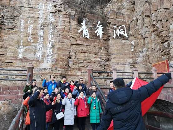 为了增强学习的直观感受,全体党员深入到太行山麓,沿着依山而建的渠道,参观了红旗渠总干渠的咽喉工程——青年洞,走在紧贴着山崖凌空而建的栈道上,看着穿山而过的红旗渠水,身临其境地感受到林州人民劈山成渠时撼天动地的恢弘场景,实地见证了红旗渠工程的伟大。在青年洞,全体党员在肖泽民书记的带领下,重温了入党誓词,再一次大声说出了对党的誓言。