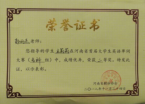 11月23日,由省翻译协会主办的河南省首届英语单词大赛决赛在黄河科技学院举行。本次大赛于6月份在线上初赛,全省90000余名本专课院校的大学生同台竞技,最终前百名获得了决赛资格。我院食品加工17级学生王莉莉在郭丽杰老师指导下,经过激烈比拼,最终荣获二等奖。另有广平17级学生苑玉文和贾姝娜获三等奖,我院获得优秀组织奖。(供稿:蒋慧萍 审稿:肖泽民)