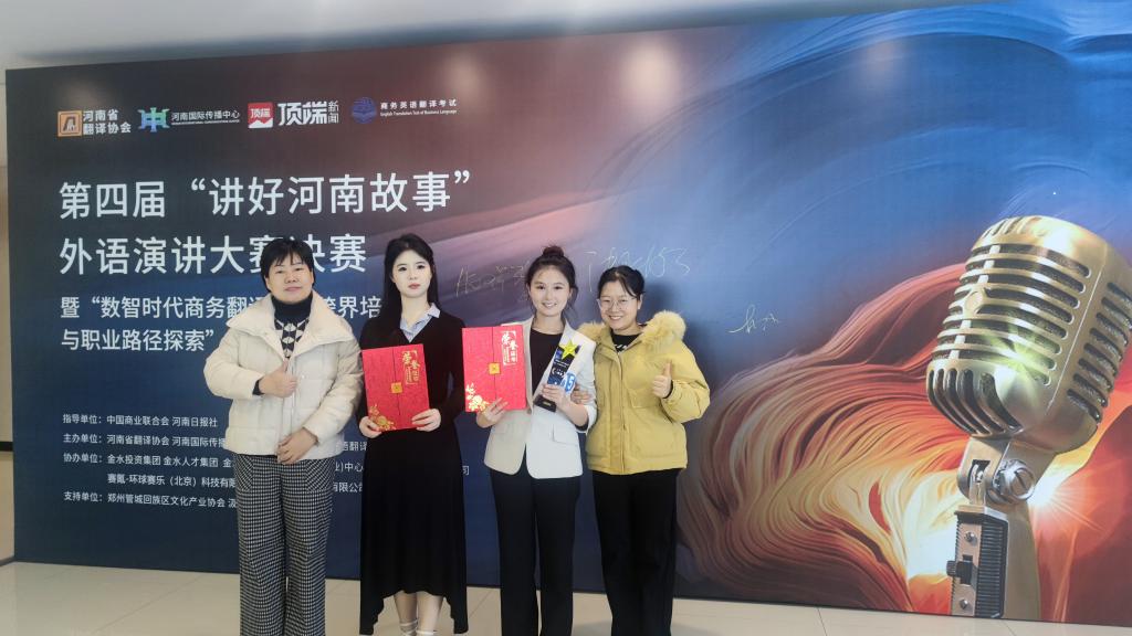 12月28日上午,由河南省翻译协会、河南国际传播中心、顶端新闻、全国商务英语翻译专业委员会共同主办的河南省第四届“讲好河南故事”外语演讲大赛总决赛,在郑州举行。我校龚家慧老师指导的财经管理学院学生王淼、吴希博老师指导的数字创意与设计学院学生袁聚娇发挥出色分别荣获总决赛一、二等奖。